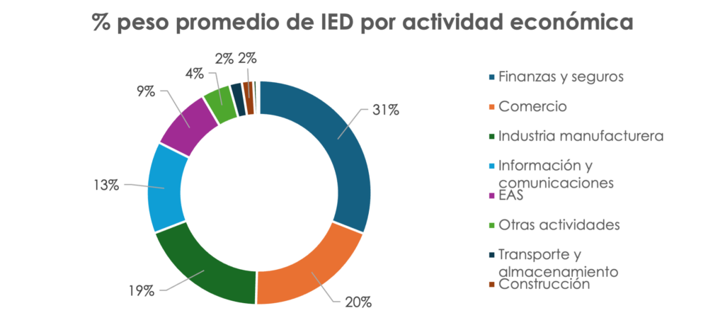 En cuanto a la composición sectorial en 2025, la IED se encuentra altamente concentrada en servicios. El sector de finanzas y seguros lidera con un peso promedio de los últimos 10 años del total de las inversiones de 31%, seguido por comercio (20%) e industria manufacturera (19%), mientras que actividades como información y comunicaciones (13%) también muestran una participación relevante. Este patrón confirma que Guatemala continúa atrayendo inversión principalmente en sectores de servicios y actividades vinculadas al mercado interno, más que en sectores exportadores.